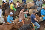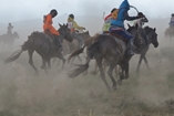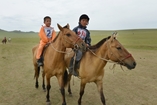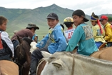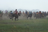 3時間ほどの行程で、高速道路から脇道に逸れると大自然の中、道なき道を行くと忽然と町が現れました。早速郡長に挨拶(馬乳酒を飲む)の後、開会式と少年達(10歳~13歳)の競馬を撮影しました。